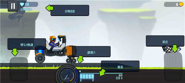 左侧按钮用于刹车,右侧按钮用于加速,顶部显示货物信息,中部展示速度和能源状态。