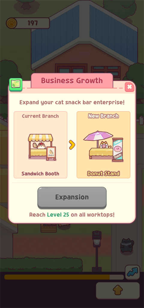 8、工作台升至25级后,即可扩展您的猫咪小吃店业务,例如开设分店或经营甜甜圈店。