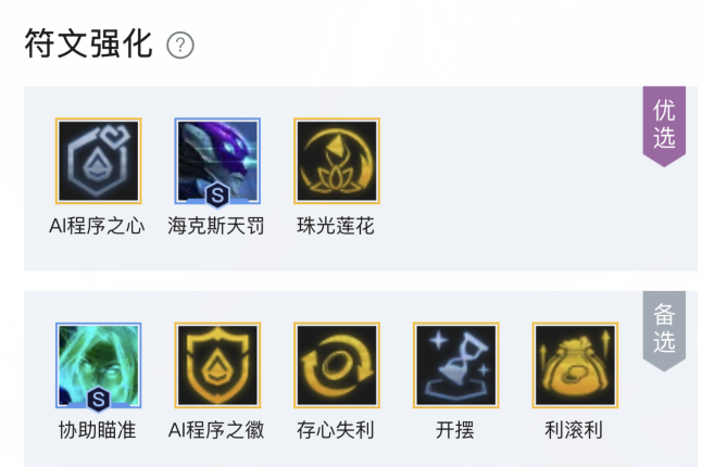 5.强化符文选择:优选AI程序之心,海克斯天罚,珠光莲花;次选协助瞄准,AI程序之徽,存心失利,开摆,利滚利,有AI转可以选择6AI。