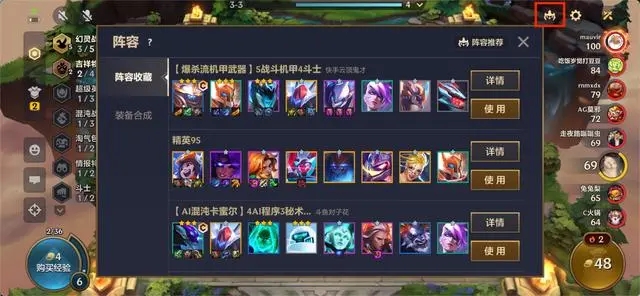 右上角阵容按钮可查看当前热门推荐阵容,也可以自己先预先设置。