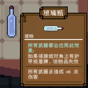 属性:所有盾牌皆会附带此效果:当盾牌被使用时,使用与它相邻的武器;且在盾牌被使用时,与它相邻的武器在本场战斗中的伤害降低1。