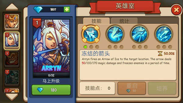 英雄:进入英雄机制界面,左侧一列展示着游戏内全部英雄。亮起的角色代表已解锁可使用的英雄,灰暗的则是尚未解锁的。若想解锁,点击该角色,可用钻石购买解锁。已解锁的英雄,点击后能提升其等级,等级提升会显著增加伤害。而且每升一级,就能培养一个新技能。