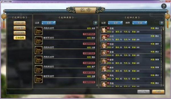 任命中分为4个部分【任命太守】这是更换自己城池太守的方法,玩家可自行选择一个有能力的太守。任命太守时,建议玩家选取能力高,野心低的武将,随时注意太守的忠诚度,以防太守反叛。