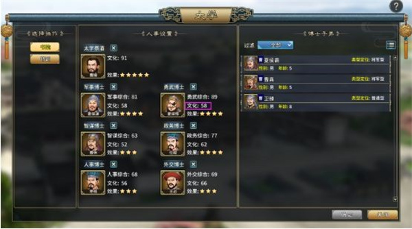 在分配教师时,除了优先考虑能力较高的候选人外,还需注意一个关键点:文化素养越高的教师,其教育效果往往越佳。相比之下,缺乏文化底蕴的教师,其教学效果通常不尽如人意。合理配置每位教师,他们的能力和教学效果将直接影响子女在太学中每年基本能力的成长幅度。