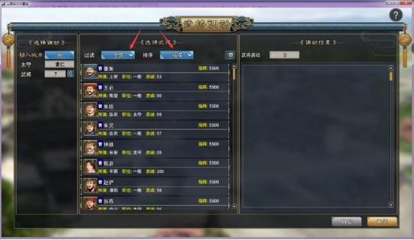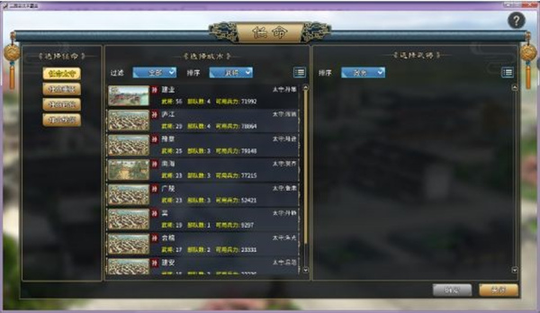 【移动】就是武将调动,一般都是将后方的优秀武将往前方战场城市调动,选择一座城池后,通过第二图的筛选,将某个城池的某个武将移动到想去的那个城池。注意【太守】是不能进行移动的,如需要,先要到【任命】里更换太守。前期武将数量不多时,把优秀武将平均分配到每个城,任命成太守,提高分城的政务效率。