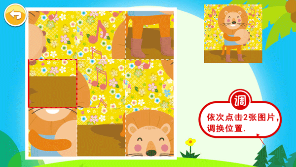 3、调动就是依次点击两张图片,调换它们之间的位置,按照右上方给的完整图案来拼出一个正确的图片。