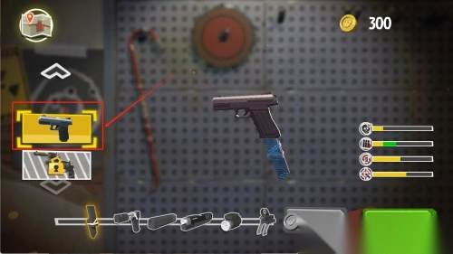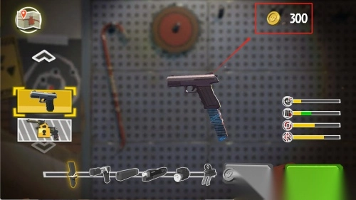 1. 当进入武器界面,留意到当前金币数量为300。此时,点击被黄色框选中的手枪图标,若想解锁或升级该武器配件,需消耗400金币。