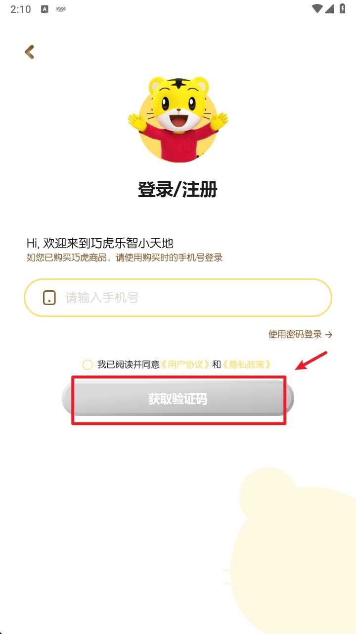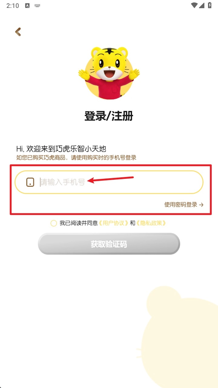 1. 打开 App 后会进入登录/注册页面,输入你购买巧虎商品时使用的手机号完成登录准备。