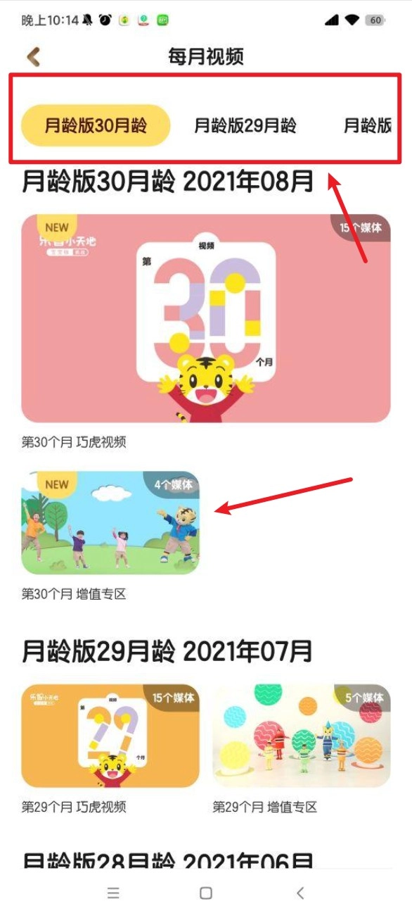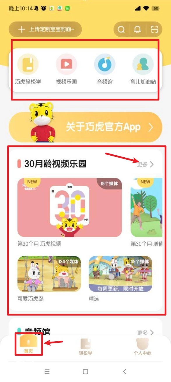 4. 点击首页推荐区的“更多”,进入每月龄版本内容页,查看适龄学习视频与增值专属内容。