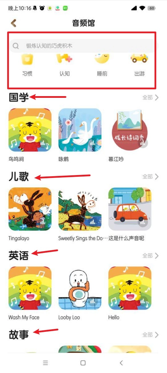 5. 要是您想聆听音频内容,可切换到“音频馆”页面,依据分类浏览国学、儿歌、英语以及故事等栏目。