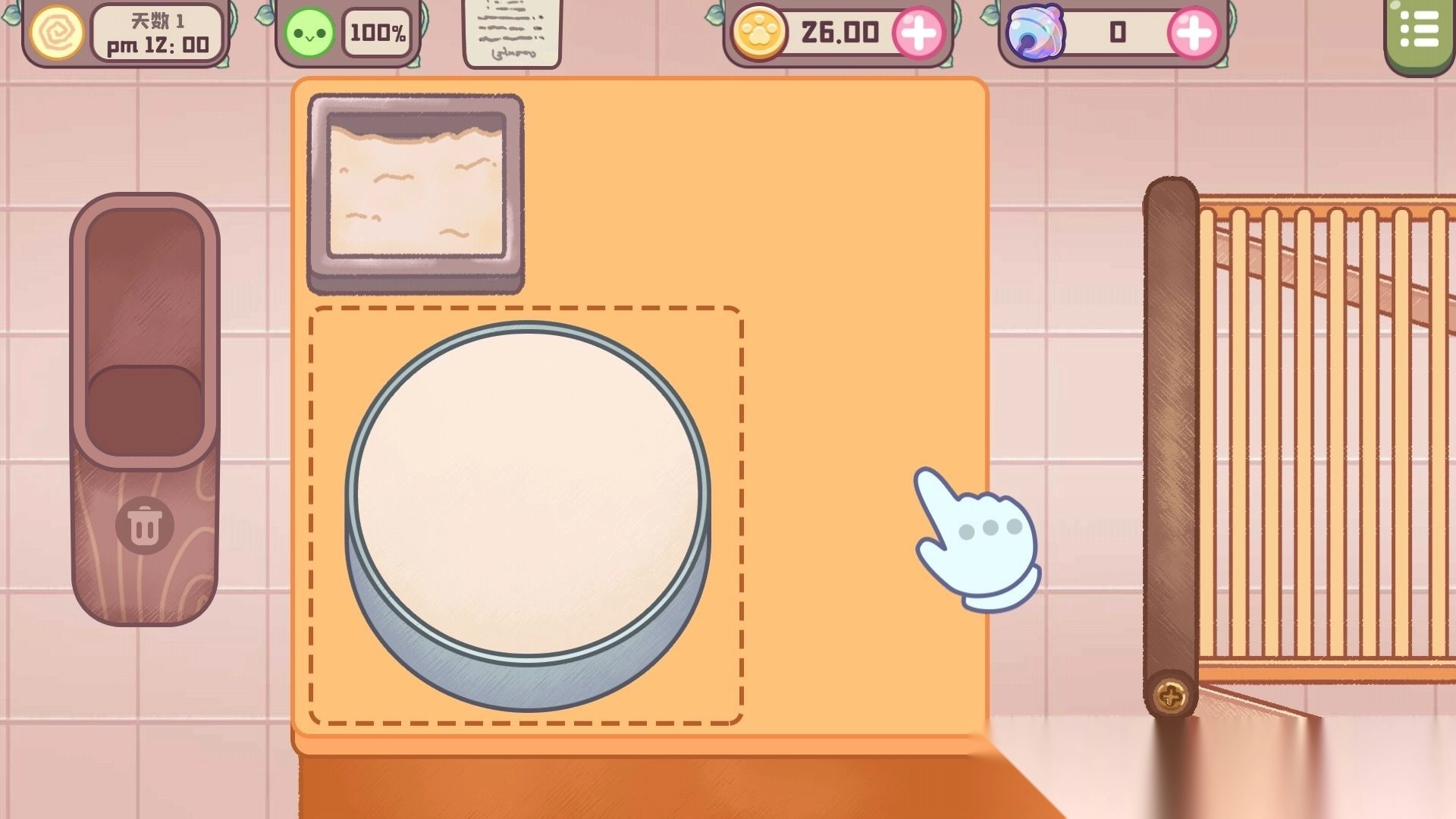 3、跟随系统的引导进入蛋糕制作流程,我们先点击小方盒的面粉,接着点击桌面