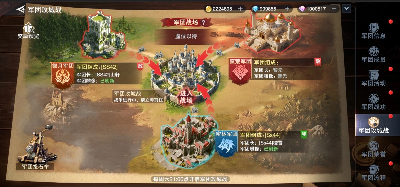 军团攻城战以军团为单位,每周六21:00开启,届时3个军团可进入战场参与比拼。