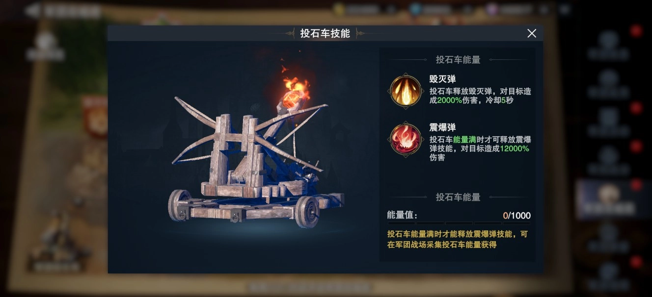 战场上仍有2辆投石车,它们会不断对城门或者军团首领造成损伤。与此同时,收集战场里投石车的能量,能够给本军团的投石车补充能量,一旦能量值达到满格,便会即刻释放投石车的大招技能,进而造成高额伤害。