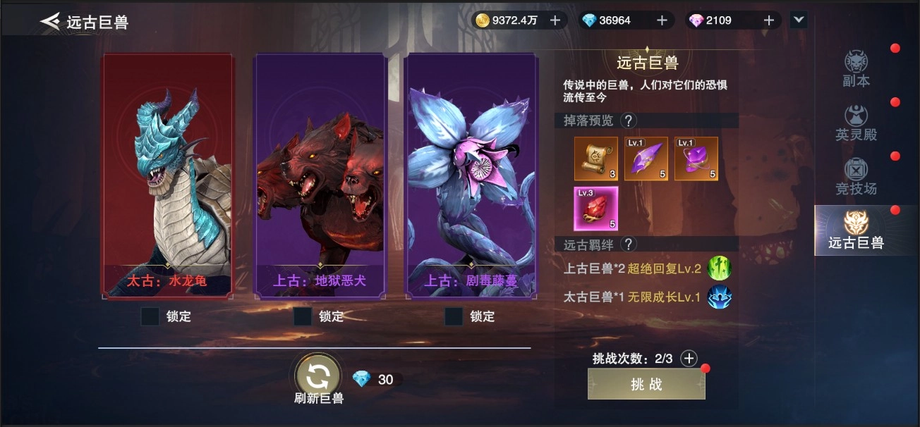 远古巨兽震撼降临!勇者们可于玩法界面刷新远古巨兽,这些巨兽带有“上古”“远古”“太古”三种前缀。依据巨兽前缀,副本内会生成对应的远古羁绊,勇者们务必谨慎应对羁绊效果!