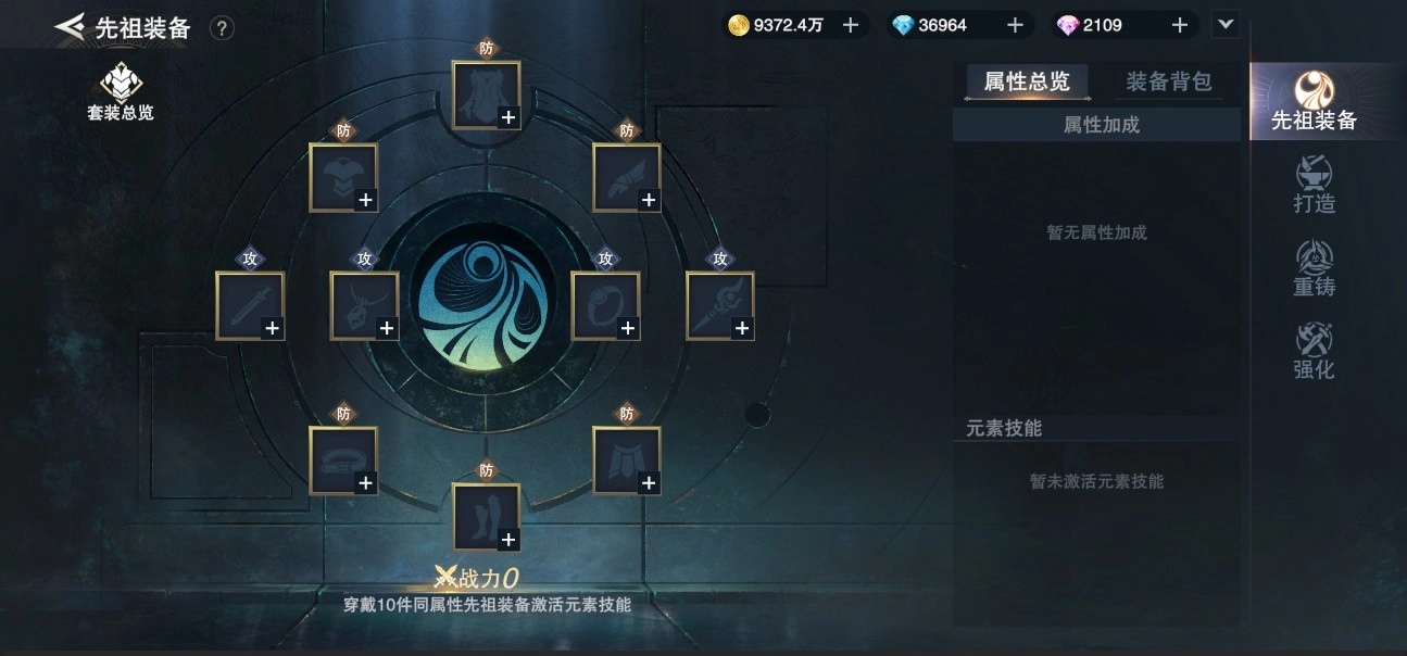 先祖装备一共有10个部位。分别为:战刃、法杖、护肩、胸甲、护手、护腰、护膝、战靴、戒指、项链。