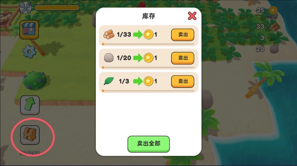 3、资源收集系统:当靠近树木时,可自动收集木材;石块采集流程设计十分便捷,不会给玩家带来操作负担。