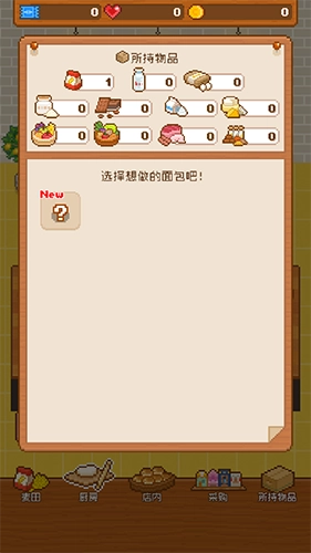 2、配方选择(第二张),优先做“小麦面包”(1小麦+1面粉),成本低、卖得快;攒钱解锁“牛奶面包”配方。