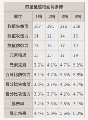 圣遗物的主属性仅有一条,但副属性可以有多条或完全没有(1星圣遗物)。