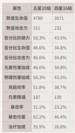 数值生命、数值攻击,为花、羽20级数值的1/16。