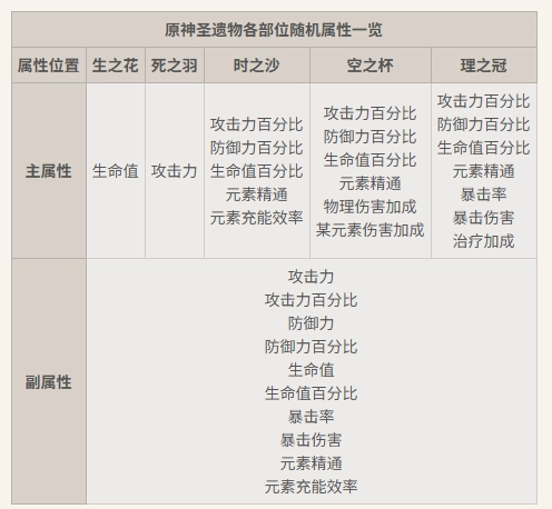 在获得圣遗物时,生之花、死之羽主属性固定分别固定为数值生命值与数值攻击力;时之沙、空之杯和理之冠主属性随机(可能的属性参考下表)。