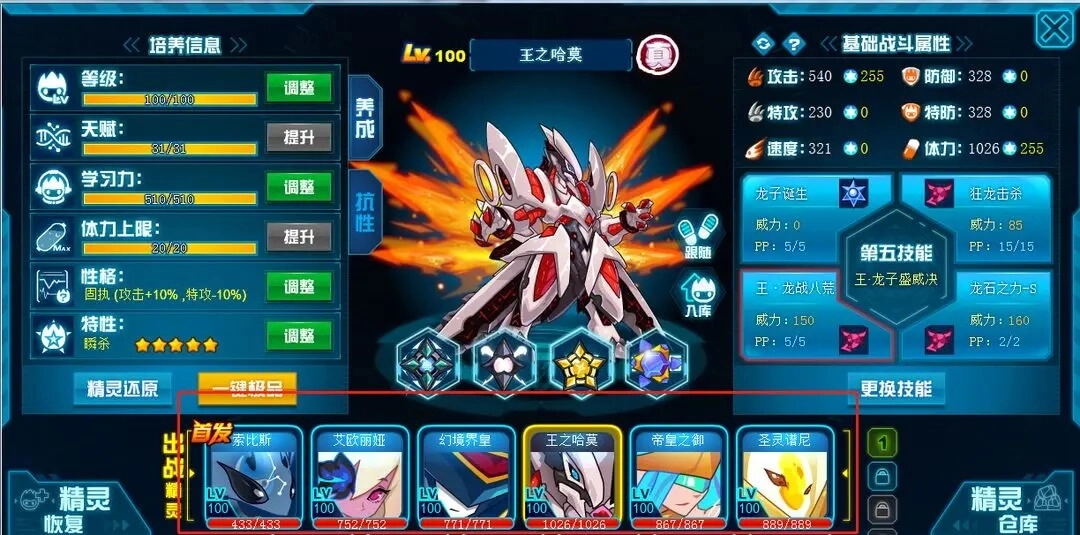 “龙子诞生”不仅能将对战中的王之哈莫进行属性上的提升,而且还有体力恢复的效果。所以大家可以放心使用该技能,待属性强化至五级以后,配合上第五技能“王·龙子盛威决”即可将精灵王们击败。