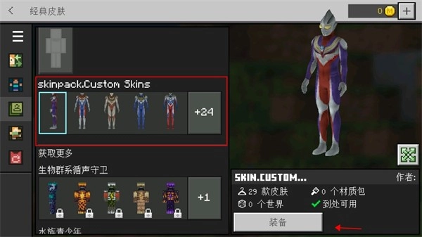 在更衣室页面里,找出第三个呈绿色的选项,然后点击该选项。如此操作后,你将会进入皮肤选择页面。在此页面,你能够查看自己下载的皮肤包内的全部皮肤。