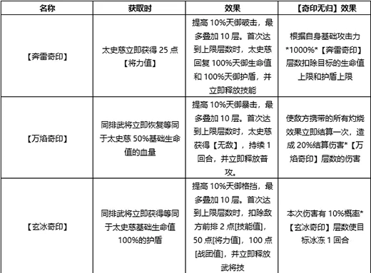 对敌方全体造成13834%的天御伤害,同时附加【奇印无归】效果。消耗不同的奇印,会产生不同的效果。有小伙伴觉得这个技能太过复杂。但仔细研读,太史慈的技能其实并不难理解,它是以奇印为核心构建的。若任意敌军同时被施加三种奇印,太史慈就能不消耗奇印且无消耗地释放一次武将技。太史慈各种奇印效果具体总结如下: