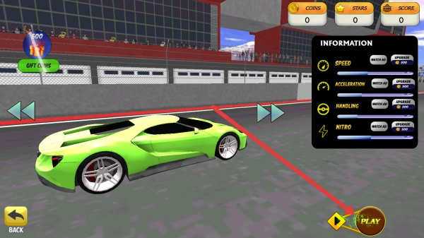3、在比赛过程中,驾驶者需熟练操控赛车,适时借助氮气(NITRO)实现加速。凭借卓越的操控(HANDLING)能力,在赛道上超越对手,风驰电掣般冲过终点线。成功抵达终点后,不仅能够赢取金币(COINS)与星级(STARS),还可解锁后续关卡以及更多车辆,开启全新的赛车之旅。