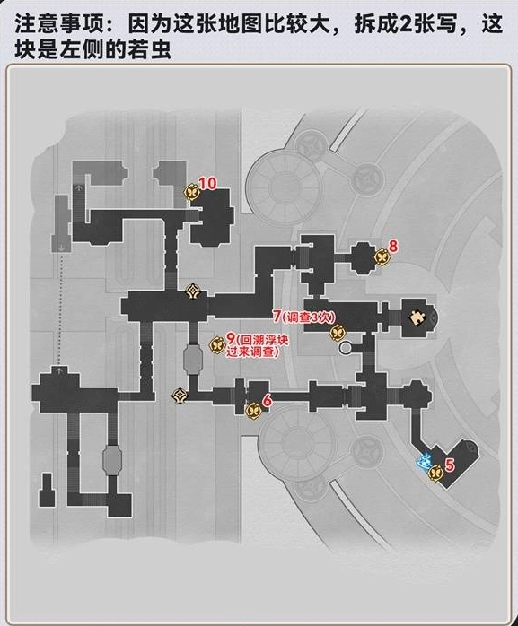 2、左侧区域:依照图中5、6、7、8、9、10的标记进行收集。在此过程中,针对标记7的内容需要开展3次调查;而对于标记9,要借助回滑浮块机制,沿着特定路线对各个点位展开探索。