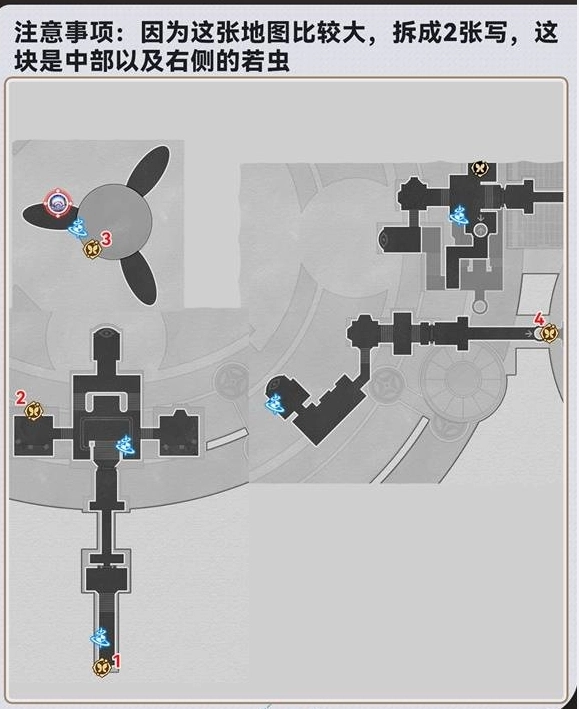 3、中部及右侧区域:按照1、2、3、4所标记的位置进行收集,仔细观察地图里的建筑结构以及蓝色标记,顺着路线依次排查,以获取若虫。