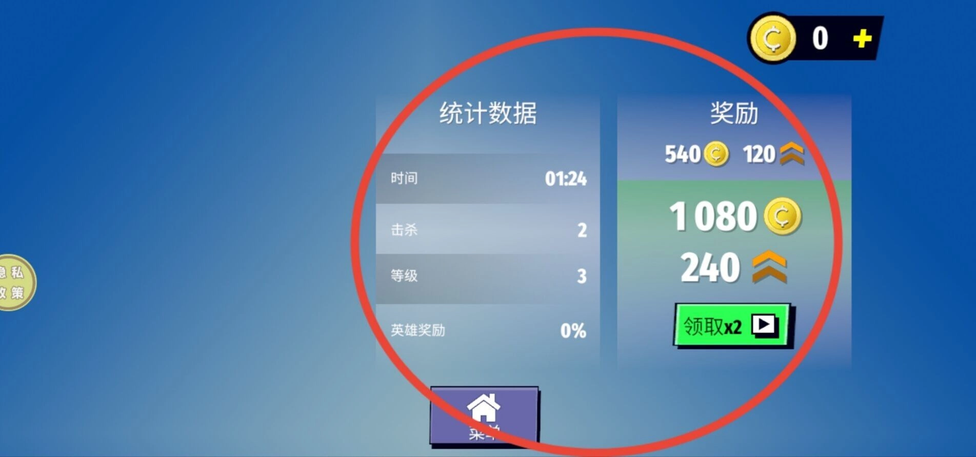 3、中途退出战斗时会统计本次战绩,包含消灭敌人数目、战斗持续时间和获得的金币数量等数据。