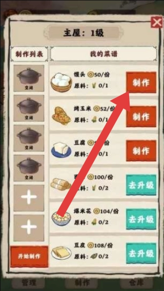 1此处展示的是主屋处于1级状态下的制作界面,在该界面中,玩家能够制作诸如馒头、烤玉米、豆腐之类的食物。制作过程涉及食材的消耗以及具体的制作操作,这一系列内容属于模拟经营与料理制作玩法的范畴,玩家可在此界面展开烹饪生产活动。