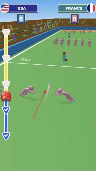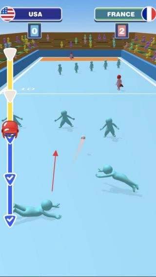 3、防守拦截法国队防守时,控制球员,预判棒球轨迹(红箭头),滑动屏幕拦截,阻止美国队得分,完成“投-打-守”循环对战。