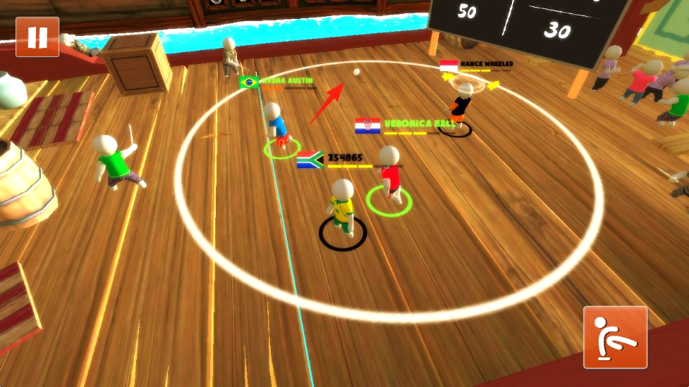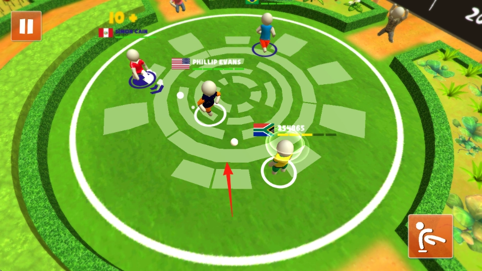 2、竞技机制(在圆形场地,争夺白球,通过传球、碰撞,将球带入对方区域得分,支持多人实时对抗(多国旗角色同场)。