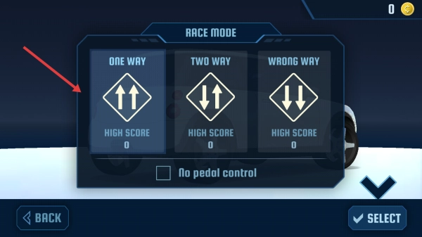 1、点击主界面播放键,进入模式选择,初次体验选“ONE WAY”(单向)模式,熟悉赛道规则,点击【SELECT】确认,驾驶白色赛车出发。