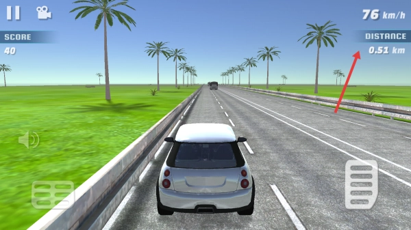 2、在公路行驶时,控赛车方向避其他车辆,关注右上角“DISTANCE”(距离)与“km/h”(速度),保持高速,借单向车道优势超车,积累分数。