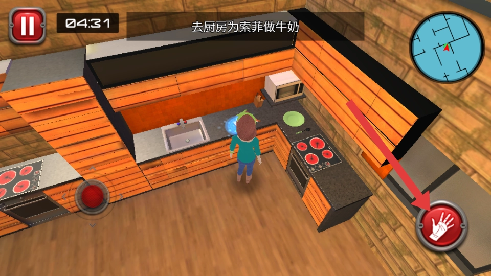 2、待对话结束,依照任务提示移步至厨房,点击获取牛奶制作所需材料,长按右侧完成牛奶的制作,准备把牛奶给索菲送去。