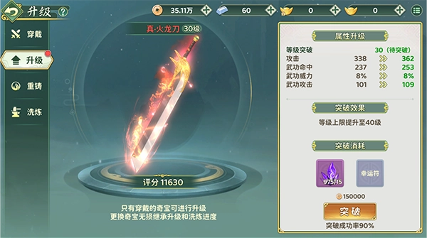 奇宝每提升10级,便需经历一次突破,突破完成后才可继续升级。而且,奇宝的等级越高,其突破成功的概率就越低。