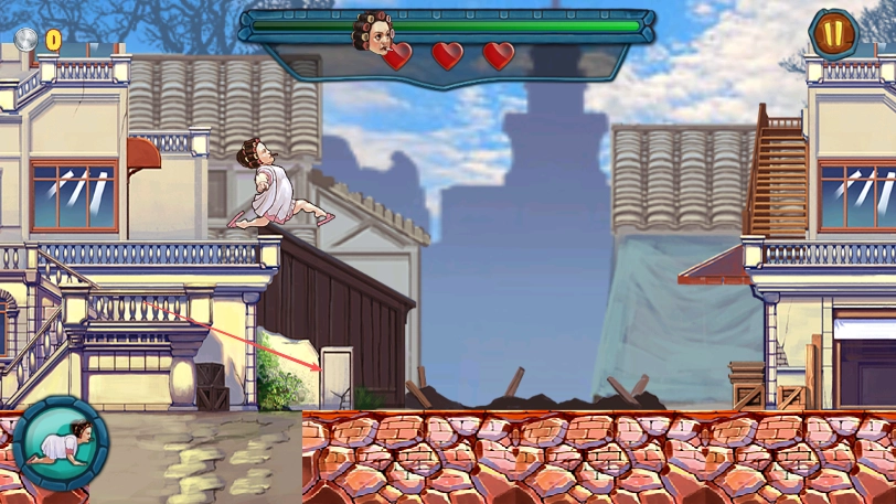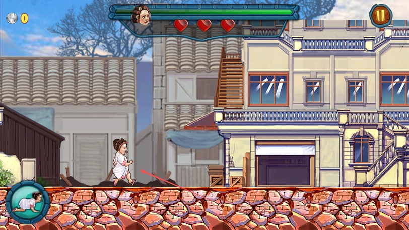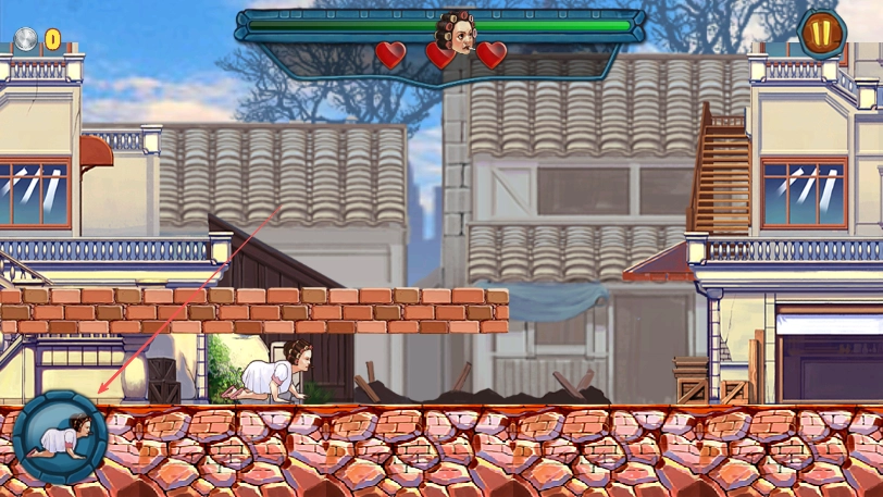 2、操控睡袍女汉子这个角色进入游戏,在砖石地面场景里移动,要留意上方生命值的三颗红心标志。