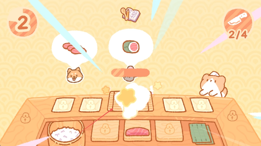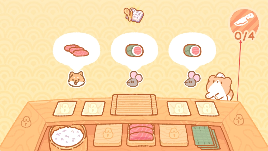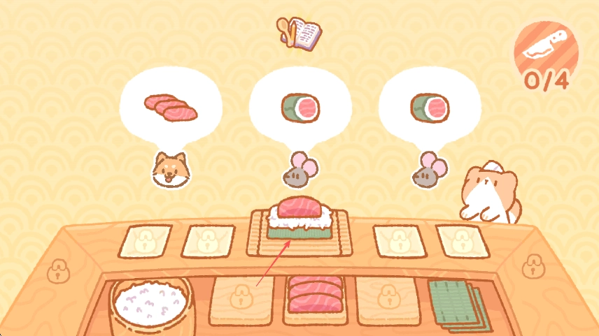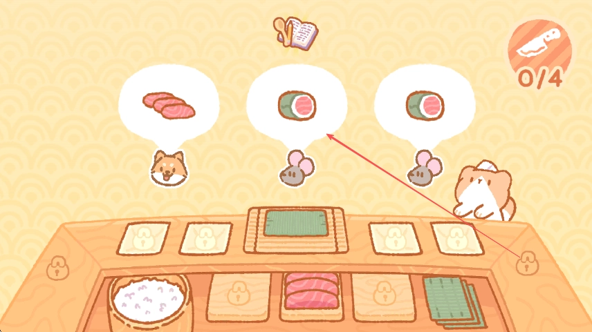 1. 通过观察界面上方小动物气泡里的寿司样式,来确定订单需求,同时要留意订单完成进度显示的0/4 。