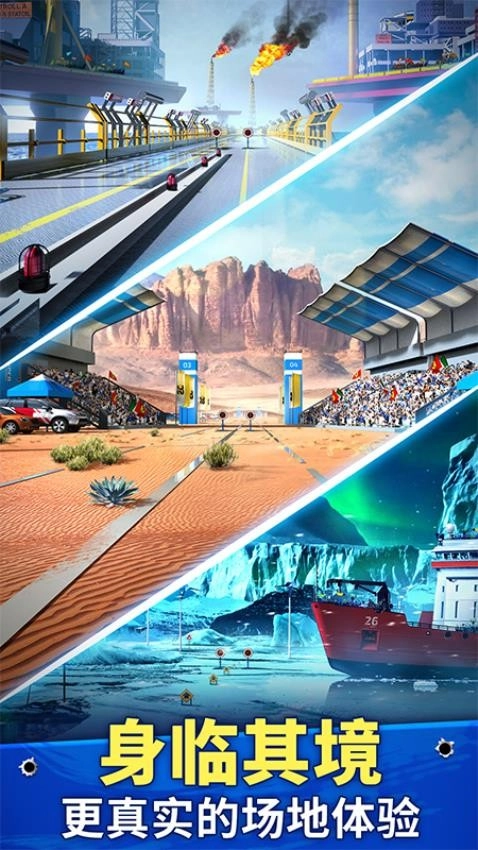 2. 从繁华城市,过渡至茂密森林,再辗转到广袤沙漠,丰富多样的关卡场景,开启别具一格的射击挑战。