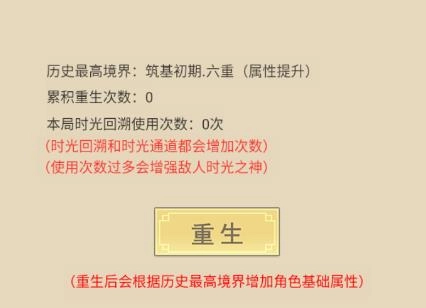 14、来到此处,或许不少玩家会遭遇失败,这并无大碍。无论是选择时光回溯,还是时光隧道,皆可解决,此功能能够无限次使用。随后,我们借助回溯的时间,接着刷秘境,提升境界。当时间来到道历6年,之前那只异兽便会再度袭来,要是抵御失败,就继续回溯时间。在将境界提升至金丹期后,可考虑重生一次(重生会依据历史最高境界增加属性,因此迟早都得重生)。倘若你愿意多花费些精力,也能等境界达到元婴期再重生,效果并无差别。