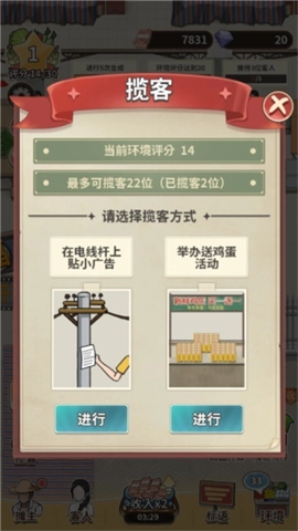 3、点击左下角的“揽客”按钮,系统将吸引客人前来,根据客人的评分来决定是否招待,评分越高,潜在收入越高。