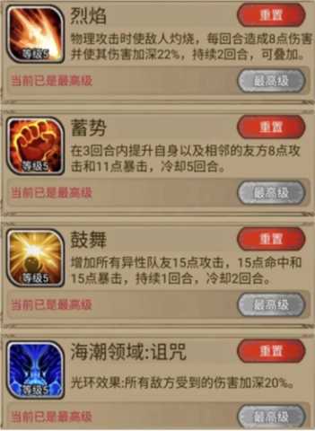4、组合为烈焰、蓄势、鼓舞以及海潮领域,其效果为诅咒。