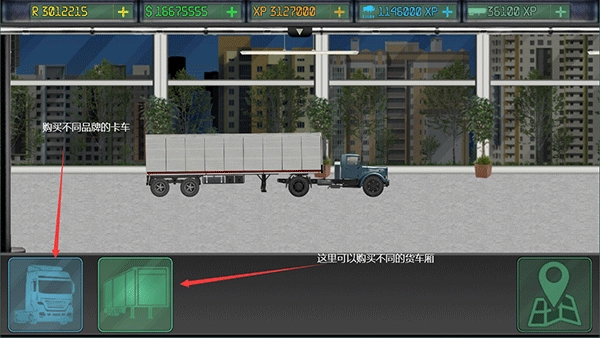 3、在购买卡车的时候,你能够随心所欲地挑选各类品牌的卡车以及不同的货车厢。只是,通常情况下,你得操控一辆卡车开展运输工作,通过赚取更多金币,才有能力去置换一辆更新更好的卡车。然而,在这个版本里,一开始就会拥有大量金币,赶紧去购置你心仪的车辆吧。