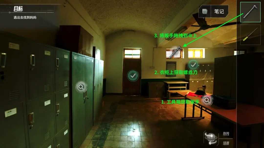 第二步:于【逃出更衣室】的场景探索环节,从工具箱内取得“扳手”,在衣柜上拿到“螺丝刀”,接着将扳手拖至窗户处的⊕上。
