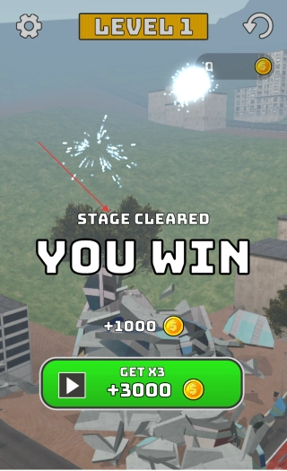 4、当玩家成功拆除建筑后,关卡完成,游戏界面会显示“STAGE CLEARED YOU WIN”,同时玩家将获得金币奖励。