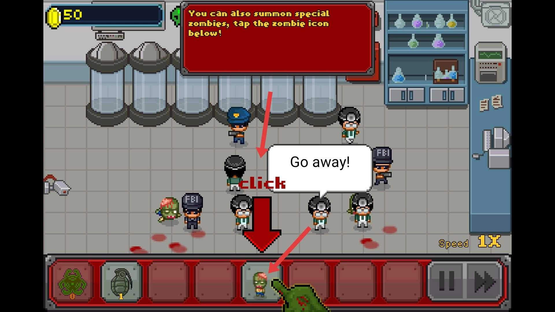 3、在教程里,点击下方的僵尸图标,就能召唤特殊僵尸,帮助感染人类,推动游戏进程。