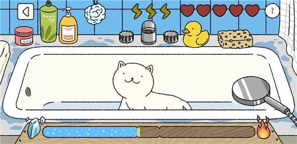 8、给猫洗澡:这一环节相对繁琐,需通过控制手机左右高度来使进度条保持稳定。当进度条处于绿条位置时,此时水温适宜,便可拖动淋浴头为猫洗澡。要留意的是,每次成功洗完澡后,水温会有所上升。要是你是使用模拟器进行游戏的玩家,别忘了及时将淋浴头拖至右下角,因为猫一旦走上淋浴头所在位置也算完成相关操作。之后还需对模拟高度进行调整。