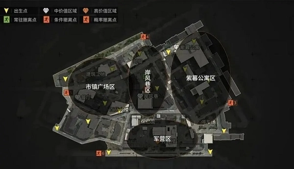 与农场、山谷以及北山相仿,军港也有普通模式和封锁区模式这两种。今天我们主要针对普通模式展开解析,封锁区的相关内容日后再和大家分享。首先,我先带领大家简略认识一下军港的地形。军港属于标准的巷战型地图,房屋与街道纵横交错,依据建筑群,我们能将军港大致划分成四个区域:位于西北的市镇广场区,处于中间位置的岸风巷区,东部偏北的紫暮公寓区,以及在南部独立成一片的军营区。